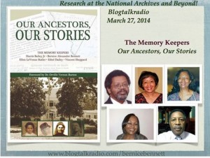 Well I must admit that I had a great time last night as I was guest host for the Blog Talk Radio program Research At the National Archives and Beyond. The guests were the Memory Keepers who have collaborated on the production of the book, Our Ancestors Our Stories. These five researchers shared with listeners their journey to publish pieces of their genealogical journey. This is the kind of project that I hope will inspire people and make them realize that they too can do the same thing. You know many feel that they are on a solo journey and yes the research is such a process a solitary one, but collaboration might just allow you to share what you have been working on. In addition, sometimes you don’t have the huge family saga—but you do have some interesting anecdotes to share about your experiences. Well others do as well, and it is hoped that you will pay attention to what these five researchers have done. If you missed the program is is already archived and can be heard on Blog Talk Radio. And the show produced by Bernice Bennett airs every Thursday evening at 9pm EST.